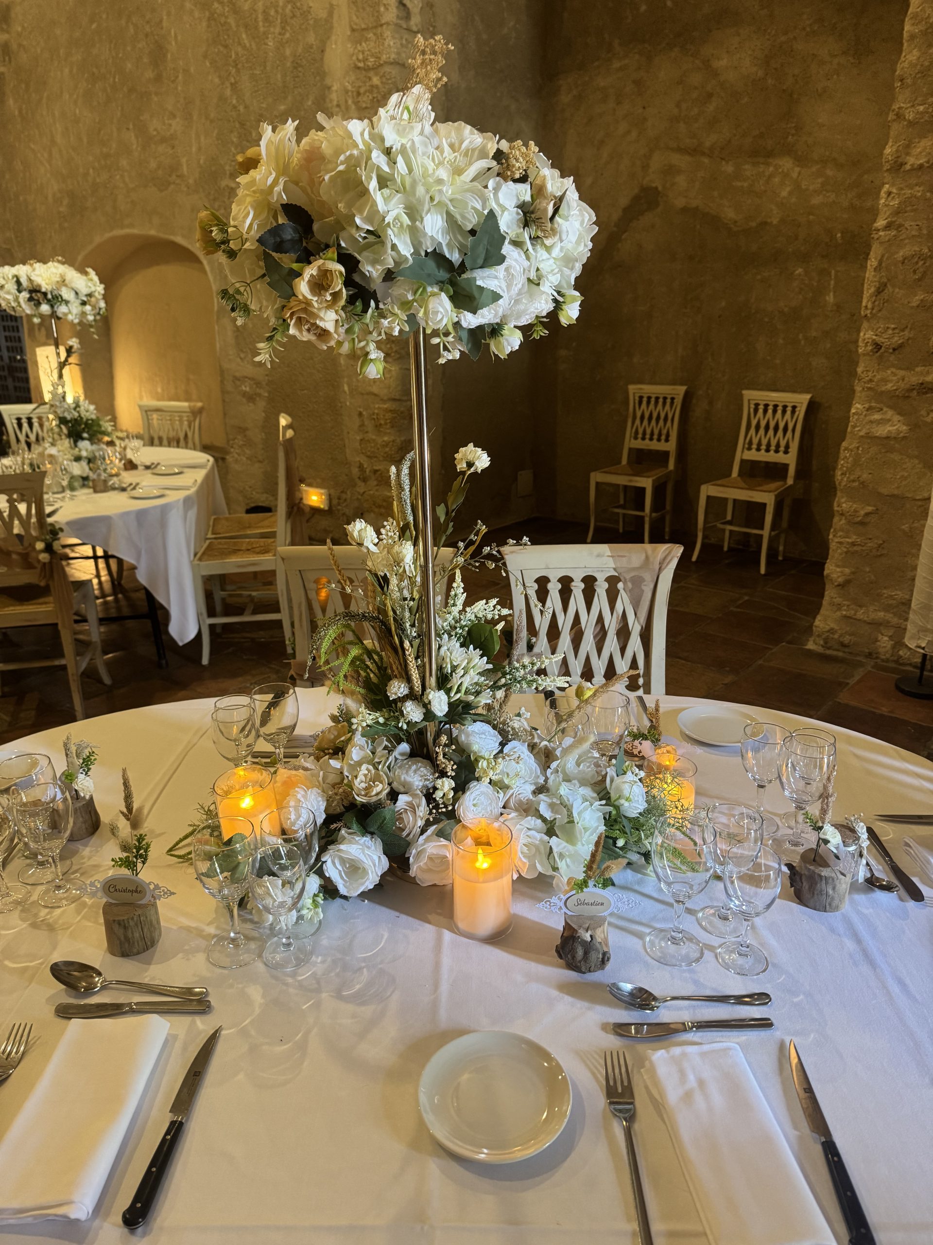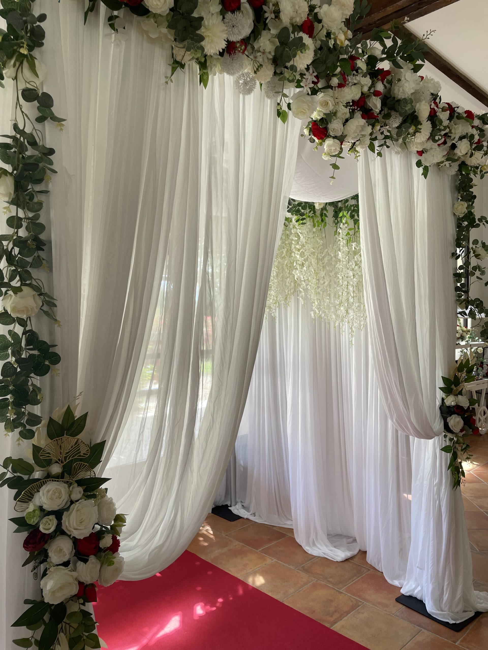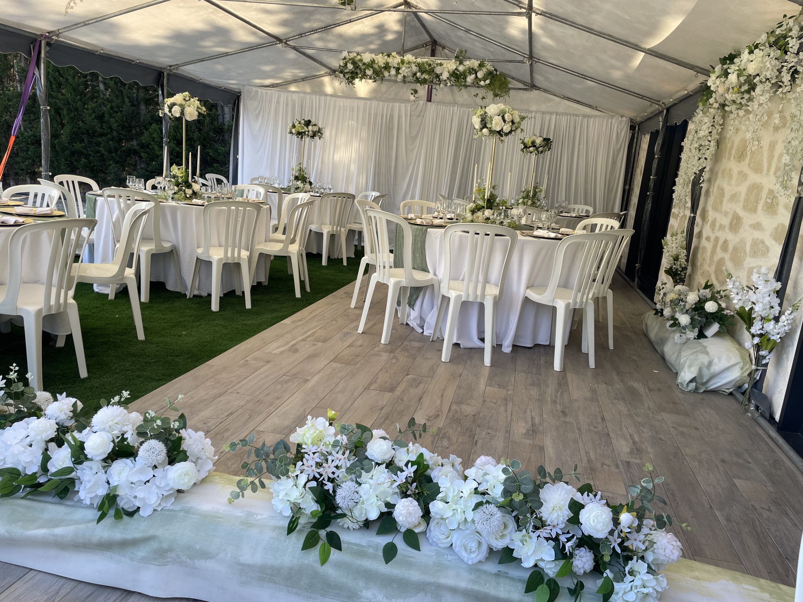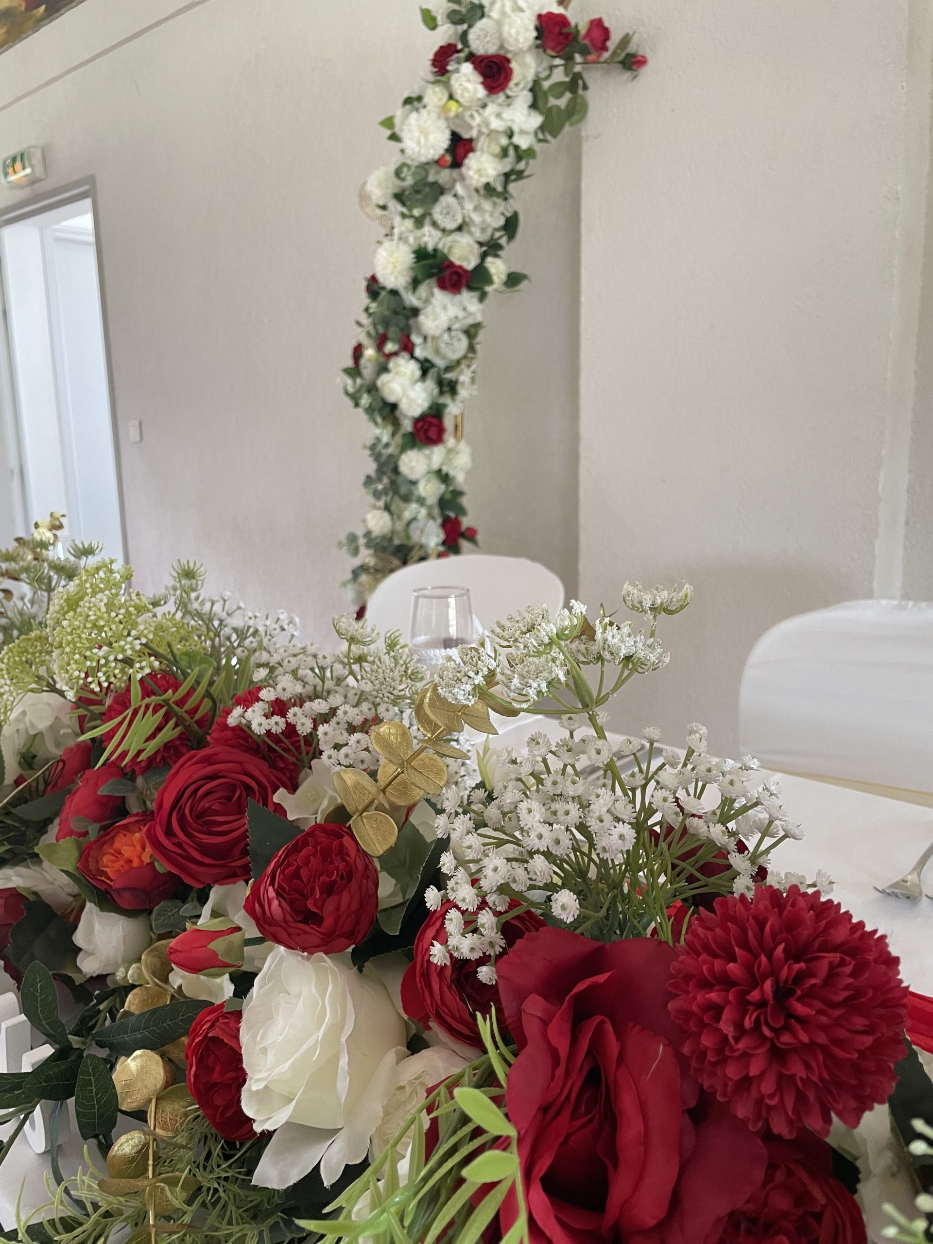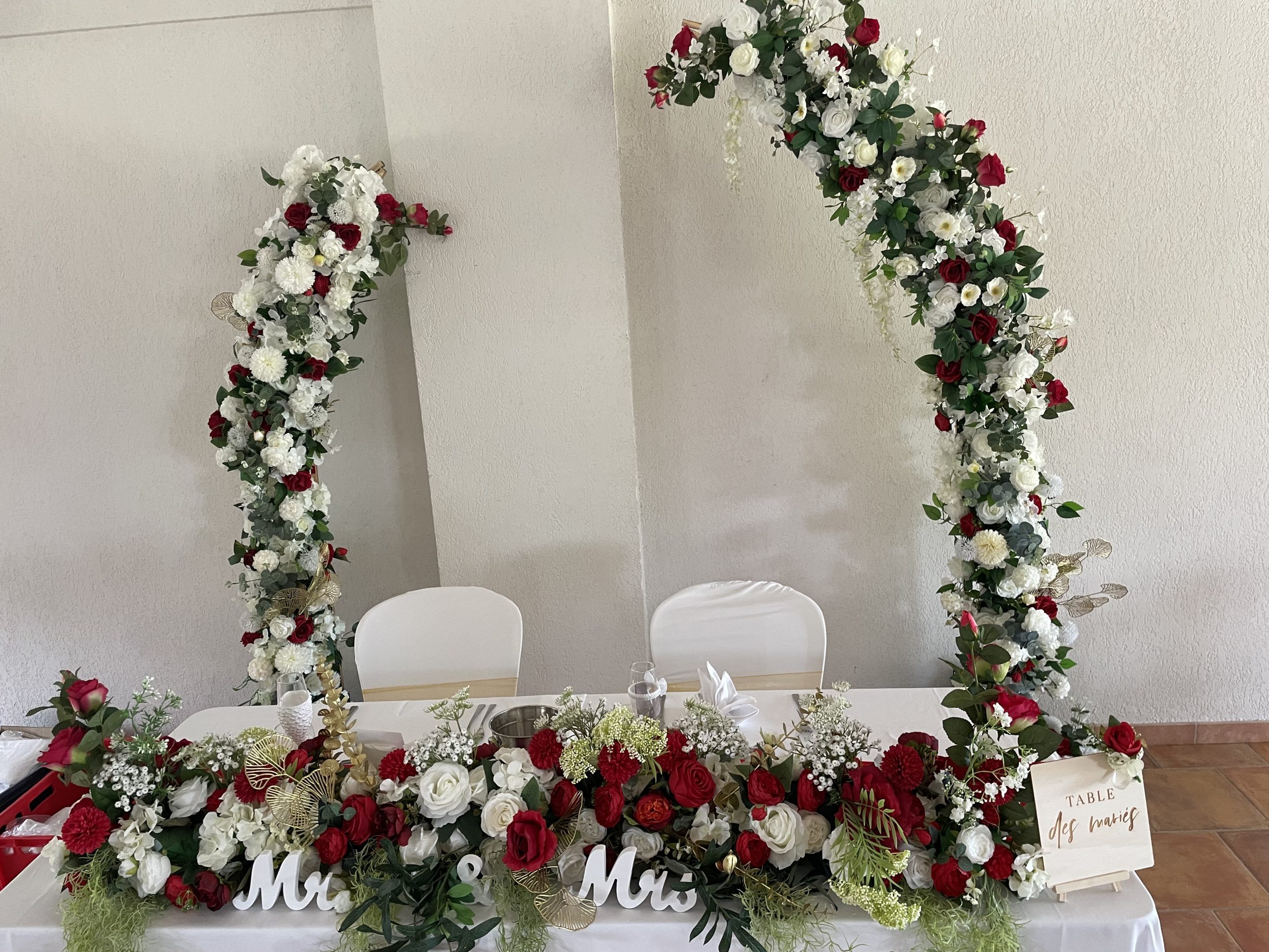 Nous mettons tout notre savoir-faire au service de votre bonheur : décoration de salle de réception, mise en scène de cérémonie laïque, création de centres de table, arches fleuries, panneaux de bienvenue, ou encore détails de table harmonisés. Nos compositions, souvent réalisées avec des fleurs artificielles de qualité premium, allient raffinement et durabilité pour un rendu parfait tout au long de la journée.